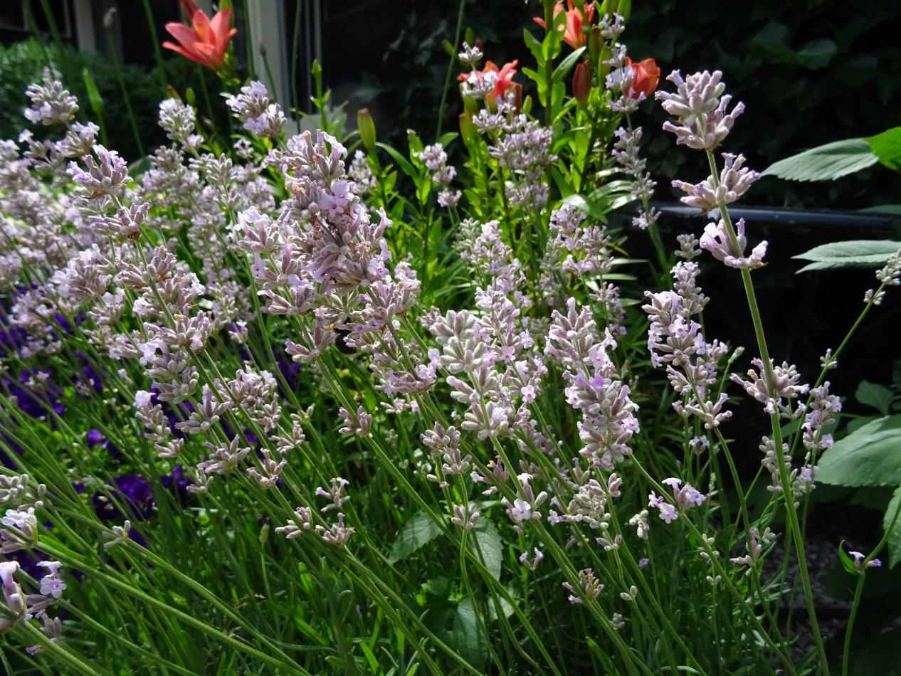 Langgerekte aren met lichtroze bloemen. Midden hoge bossige planten