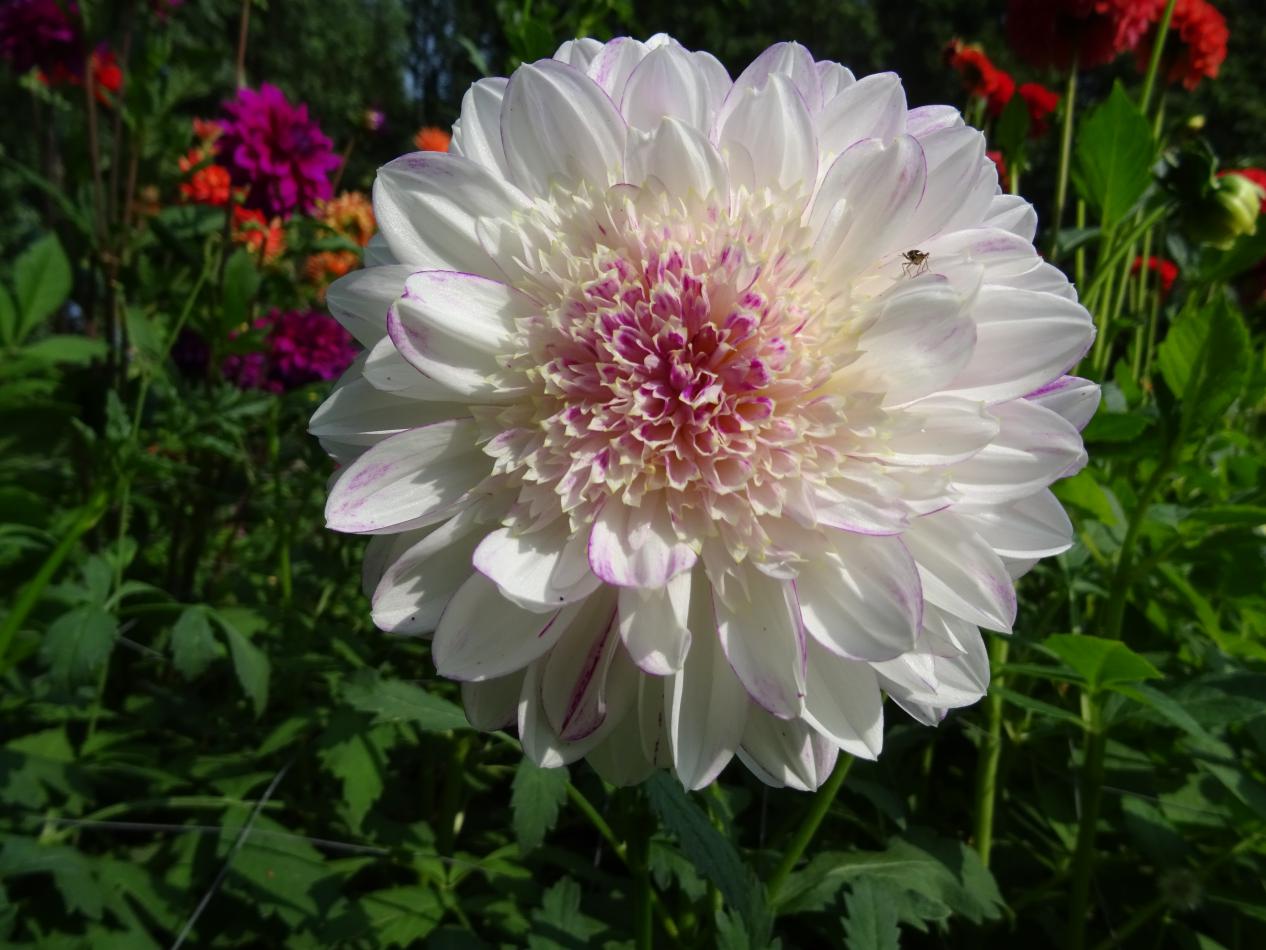Foto Databank Dahlia's Q: Que Sera 1 Registratie:19-07-2005 Registrant: H.B. van Bentem Kweker : onbekend Beschrijving: Samenvatting kleur: wit 155D met violet N78C. Binnenzijde straalbloemen: wit 155D met secondair violet N78C. Buitenzijde straalbloemen: wit 155D met secondair violet N78C. Buisbloemetjes wit 155D, naar de top geelgroen 1D met kleine violette N78C vlekjes. Top bl.bl. gespitst. Blad groen. Steel groen met paars: Bladeren bipinnaat. Bloem horizontaal tot opgericht. Hoogte 120 cm